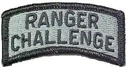 The Ranger Challenge tab is the only United States Department of the Army individual qualification tab awarded exclusively to Reserve Officers' Training Corps cadets, and approved by the Institute of Heraldry.[1] This award is presented annually to cadets who compete in regional ROTC Ranger Challenge competitions.