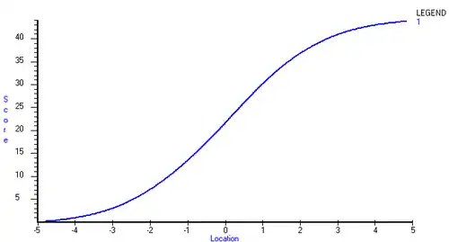 When all test-takers have an opportunity to attempt all items on a single test, each total score on the test maps to a unique estimate of ability and the greater the total, the greater the ability estimate. Total scores do not have a linear relationship with ability estimates. Rather, the relationship is non-linear as shown in Figure 1. The total score is shown on the vertical axis, while the corresponding person location estimate is shown on the horizontal axis. For the particular test on which the test characteristic curve (TCC) shown in Figure 1 is based, the relationship is approximately linear throughout the range of total scores from about 13 to 31. The shape of the TCC is generally somewhat sigmoid as in this example. However, the precise relationship between total scores and person location estimates depends on the distribution of items on the test. The TCC is steeper in ranges on the continuum in which there are more items, such as in the range on either side of 0 in Figures 1 and 2.