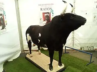 Ratón ("Mouse" in English) (April 2001 – 24 March 2013) was a Spanish fighting bull that was nicknamed el toro asesino[1] (the killer bull), el sangriento toro Raton[2] (the bloody bull 'Raton') and el terrible Ratón[3] (the terrible Mouse) for killing three people in bullfighting rings in Spain during 2006–2011[1] and injuring thirty more.[4] The bull became legendary in Spain due to the large number of gorings for which he was responsible. Bullfighting fans regarded him as a star and traveled from across the country to see the morlaco (big bull) at his home at Sueca near Valencia. Matador Jesús Esteve said of Ratón: "He is a killer. He is lazy, he doesn't want to participate. He does his own thing, waiting for somebody to make a mistake. And then when he gets you, he wallops you, and he doesn't let up."[5]