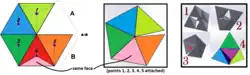 Many polyhedra are constructed involving regular tetrahedra. By truncating the vertices of a regular tetrahedron, it becomes a truncated tetrahedron.[12] The dual of this solid is the triakis tetrahedron, a regular tetrahedron with four triangular pyramids attached to each of its faces. i.e., its Kleetope.[13] Some Johnson solid such as elongated triangular pyramid and elongated triangular bipyramid are constructed by attaching one and two regular tetrahedra onto the bases of a triangular prism; the triangular bipyramid is constructed by attaching two regular tetrahedra face-to-face.[14]
