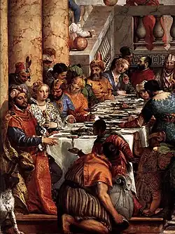 The iconographic sources also present relevant musical details, particularly with the theme of the Wedding at Cana. For example, in Ferrara, six paintings (four declinations of the Wedding at Cana, a Supper at Simon's House, and a Banquet of Ahasuerus) of banquet scenes where musicians are depicted were made in three decades between the 16th and 17th centuries.[11]
