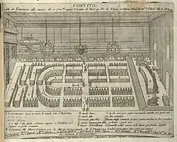 The beginning of the actual banquet was announced by the sound of trumpets and drummers that was repeated with each new course. It was customary to invite to the banquet an audience of spectators consisting of the bourgeoisie, artisans, and clergy.[1] The meal was usually accompanied by music and theatrical performances. The number of courses could comprise hundreds of dishes.