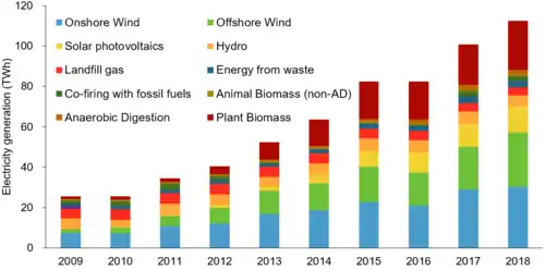 Renewable energy in the United Kingdom contributes to production for electricity, heat, and transport.