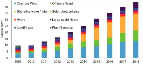 At the end of 2011, there were 230,000 solar power projects in the United Kingdom,[54] with a total installed generating capacity of 750 MW.[55] By February 2012 the installed capacity had reached 1,000 MW.[56] Solar power has increased rapidly in the 2010s, albeit from a small base, as a result of reductions in the cost of photovoltaic (PV) panels, and the introduction of a Feed-in tariff (FIT) subsidy in April 2010.[54] In 2012, the government said that 4 million homes across the UK would be powered by the sun within eight years,[57] representing a target of 22 GW of installed solar power capacity by 2020.[54] By February 2019, approximately 13 GW had been installed. [58] The FIT program closed to new applicants at the end of March 2019[2] and was replaced by a Smart Export Guarantee.[59]