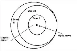 The zones are centered on the optic nerve. Zone I is the posterior zone of the retina, defined as the circle with a radius extending from the optic nerve to double the distance to the macula. Zone II is an annulus with the inner border defined by zone I and the outer border defined by the radius defined as the distance from the optic nerve to the nasal ora serrata. Zone III is the residual temporal crescent of the retina.