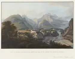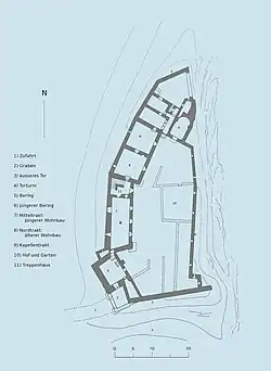The castle is located on a cliff above the Hinterrhein river near the village of the same name. The original castle site was probably surrounded by a round ring wall. However, around the 16th century the river had undercut the eastern side of the castle which either collapsed or was demolished. Today the north and south walls end at the cliff while a newer wall runs along the cliff and forms the eastern wall. The 17th century gatehouse is located in the south-west corner of the wall.[2] The inner gate tower and the northern residential wing were built in the 14th century and still show frescoes of the coat of arms of the Barons as well as a hunting scene. During the 16th century the east wall was added after the destruction of the eastern tower and the rest of the castle was repaired and renovated. Around 1700 the outer gate house was added as was the chapel on the north side. The newer residential tract was also added in the 16th or 17th century.[3]