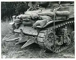 Prior to the launch of Operation Cobra (an American offensive during the Normandy campaign), solutions were developed for how tanks could effectively support the offensive within this terrain.[9] Bulldozers or tanks modified to carry a bulldozer blade were used to open gaps in hedgerows. Some hedgerows were so thick that engineers first had to blow a hole in the bank, which a bulldozer would later clear and widen. This time-consuming process slowed down the progress of the Allied offensive, and was compounded by the problem of the conspicuous bulldozers and dozer tanks being targeted by German gunners to deny the Allies a means to break through.[10] Throughout July "innumerable" inventions were created by various American units to get tanks through the hedges quickly without exposing their weak underside armor. A hedgecutter developed by the 79th Infantry Division was in operation by 5 July, and a few days later, XIX Corps demonstrated a set of prongs that had been initially developed to create holes for the placement of explosives. The force of these prongs was able to lift and remove a portion of the hedgerow, enough so that the tank would be able to push on through to the other side. Units within V Corps also invented devices, which were dubbed 'brush cutters' and 'greendozers'.[11]