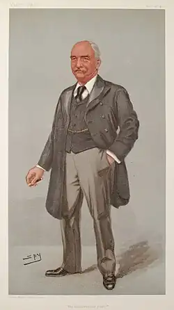 Middleton openly admitted the political benefits for the Conservatives when the Liberals adopted unpopular policies; he said he was "grateful" when Gladstone adopted Irish Home Rule; grateful again when Gladstone adopted the Newcastle Programme in 1891 and "deeply grateful" when the Liberals attacked the House of Lords and adopted the local veto on liquor licences.[1] After an appeal to Conservative workers made by Lord Salisbury and Arthur Balfour, in March 1896 Middleton was presented at the Constitutional Club with a cheque for £10,000 and a silver casket for his services to the party.[2] At the ceremony, Salisbury paid tribute to Middleton.[2]