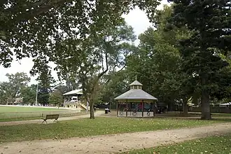 Further development occurred in the Park around the late twentieth and the early years of the twenty-first century.[5][2] The pavilion (which had been damaged by fire in 1980) was restored in 1993–94. Public amenities and a maintenance/storage building were built in "Federation style" near the pavilion. A similar style of rotunda was added to the north-west corner of the Park in 2002, across an early pathway alignment. Flower beds and additional seating were introduced. A public artwork initiative was partially implemented.[1][28]
