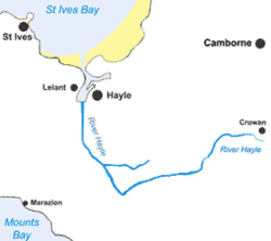 The River Hayle is approximately 12 miles (19 kilometres) long and it rises south-west of Crowan village. Its course is west for approximately 5 miles (which brings the river to within 3 miles of the south coast at Marazion on Mount's Bay). It then flows through a steep wooded valley north of the granite high ground at Trescowe Common, formerly a mining area, before turning abruptly north near the hamlet of Relubbus. It then follows a northerly course for the remaining six miles to the estuary, passing St Erth.