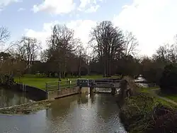From Painshill Park the river flows northeastwards to the Thames, passing to the west of Esher Commons and then forming the boundary between Hersham and Esher, where the mean flow of the river is 5.43 m3/s (192 cu ft/s). In response to heavy flooding of East Molesey and Thames Ditton in September 1968, the river was modified downstream of Albany Bridge to the Thames and new flood defences were constructed.[25] Finally the Mole splits into two branches at the Island Barn Reservoir near Molesey: the northern (and smaller) branch continues as the River Mole and the southern branch is known as the River Ember.[26] The two rivers flow either side of the reservoir, before running side by side in a northeasterly direction, merging 400 m (440 yd) before the confluence with the River Thames, on the reach above Teddington Lock.[26] (For the purposes of the remainder of this article, the River Mole and the River Ember are treated as a single entity.)