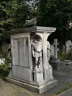 On 13 December 1866 the monument (which can be seen in the gallery beneath the Brompton Cemetery monograph, to this well-known oarsman, who was Champion of the Thames from 1846 to 1852, was formally uncovered in Brompton Cemetery. It is made of Portland stone, and is 9 ft. high, 6 ft. 6in. long, and 3 ft. 6in. wide. On the top slab is the representation of a wherry bottom upwards, over which is thrown a coat and badge, and by the side are broken sculls. This slab is supported by four figures cut out of the solid stonework, one at each corner. The figures represent four champions of the Thames : first, Robert Coombes, in his rowing costume, holding a broken scull; second, Tom Cole, of Chelsea, wearing Doggett's Coat and Badge, with the peculiar pineapple button ; third, James Messenger, of Kingston, with the coat and badge of the Thames National Regatta; fourth, Harry Kelley, of Putney, an athlete in rowing costume. Each figure stands on an octagon dwarf pedestal.