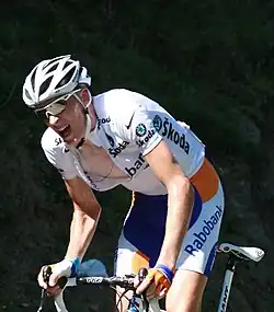 In 2009, Gesink finished fourth overall in the Critérium du Dauphiné Libéré. He started his first Tour de France but broke his wrist during a crash on stage 5. He completed the stage, but had to withdraw from the Tour due to his injuries.[10] He recovered in time to enter into the Vuelta a España. He finished the Vuelta a España in 6th place; he was in 2nd place, but due to a fall where he sustained deep cuts in his knee, he was too injured to keep up in the final mountain stage. Afterwards Gesink focused on regaining his form for the World Championships in Mendrisio, but he had not recovered fast enough and finished off the pace. However, a week later he was back to his old self and took the victory in the Giro dell'Emilia, beating Jakob Fuglsang and Thomas Löfkvist to the line in an uphill sprint. He also took 6th place in the Giro di Lombardia and finished the season as 10th on the UCI World Ranking.