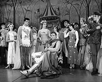 In 1959, Goulet was introduced to librettist Alan Jay Lerner and composer Frederick Loewe, who were having difficulty casting the role of Lancelot in their new stage production destined for Broadway, the musical Camelot. Lerner and Loewe, impressed by Goulet's singing capabilities, signed the virtual newcomer to play the part, opposite Richard Burton (King Arthur) and Julie Andrews (Queen Guenevere). Camelot opened in Toronto in October 1960 (Goulet was at that time still under contract to host musical programs for CBC Television). It then played a four-week engagement in Boston, and finally opened on Broadway two months later. Goulet received favorable reviews, for his introductory aria C'est Moi,[13] and most notably for his show-stopping romantic ballad, If Ever I Would Leave You which would become his signature song.[14][15][16] The music of the production was greatly appreciated by President Kennedy, who would play the cast recording at the White House before going to bed at night.[17]