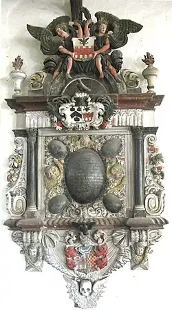 - Firstly to Mary Lethbridge (d.1709), daughter of Christopher Lethbridge (d.1713)[8] of Westaway House, Pilton, the latter of whose "big and sumptuous" mural monument survives in Pilton Church,[9] by his wife Margaret Bowchier, daughter and heiress of Philip Bowchier (d.1687) of Westaway.[10] At the base of the monument are shown impaled by Lethbridge the arms of the family of his wife Margaret Bowchier, a daughter of Philip Bowchier: Argent, a cross chequy gules and or between four water bougets gules each between four ermine spots. These are a differenced version of the arms of Bourchier, Earls of Bath, of nearby Tawstock Court: Argent, a cross engrailed gules between four water bougets sable. The Bourchier Earls of Bath (which name was spelled historically in various ways) died out in the male line in 1654 on the death of the 5th Earl. Philip Bowchier (d.1687) was the son of Rev. Roger Bowchier, vicar of Pilton during the Civil War.[8] It is not known what relationship if any the Bowchiers of Westaway were to the Bourchiers of Tawstock. childless.