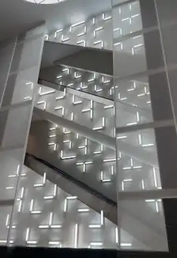 A permanent wall installation in the entrance corridor of the Allen Memorial Art Museum, the dimensions of Untitled (1980) exactly repeat those of the deep-set windows just opposite.[14] In the early 1980s, Irwin was invited to participate as a collaborating artist in designs for the rejuvenation and improvement of the Miami International Airport. In 1997 he transformed a room that overlooks the Pacific at the La Jolla branch of the Museum of Contemporary Art San Diego.[15] To celebrate its 125th anniversary, the Indianapolis Museum of Art commissioned Irwin to create Light and Space III (2008), thereby becoming the first U.S. museum to have a permanent indoor installation of the artist. For the piece, Irwin arranged fluorescent light bulbs in an irregular grid pattern across the walls surrounding the escalators, with a veil of scrim framing each side; as museum visitors go up and down between floors, they move through the piece.[16] Trifecta (Joe's Bar & Grill), a three-story permanent light installation at Swiss Re's corporate headquarters in Fort Wayne, Indiana, was inaugurated in 2012.