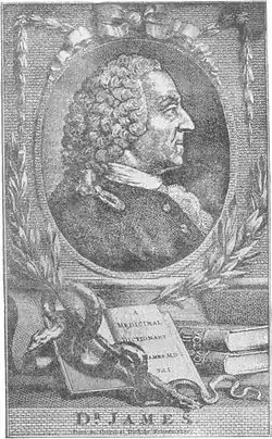James was born in 1703, at Kinvaston in Staffordshire, to Edward James, a major in the English army, and his wife Frances, a sister of Sir Robert Clarke. His early education was at Lichfield Grammar School, where he became acquainted with his fellow student Samuel Johnson. He then attended St John's College, Oxford, from which he received the degree of A.B. on 5 July 1726. He was admitted as an extra-licentiate of the Royal College of Physicians on 12 January 1727/8, and in May of the same year was created doctor of medicine at Cambridge by royal mandate. He practised at Sheffield, Lichfield, and Birmingham before moving to London, where he was admitted as a licentiate of the Royal College on 25 June 1765. He died on 23 March 1776, aged seventy-three.[1]