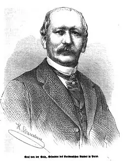 Goltz served in Paris until his death,[8] first as the Ambassador of Prussia and then, from January 1868, of the North German Confederation.[9] While Ambassador, he had to deal with the consequences of the Alvensleben Convention (which obliged Prussia to assist in the suppression of the Polish uprising).[3] Much to the chagrin of Bismarck, Goltz was said to have maintained a secret correspondence with the influential Foreign Minister Baron Alexander von Schleinitz. He was considered very popular at the court of Napoleon III, and Napoleon's Prussian-friendly attitude was said to be thanks to Goltz.[10] After his death, he was succeeded by Karl von Werther.[11]