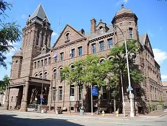 The 19th Ward is a southwest neighborhood bordered by Genesee Street, West Avenue, and the Erie Canal, and is across the river from the University of Rochester. The neighborhood is one of the largest in Rochester.[65][66] Now known by its slogan "Urban by Choice",[67] in the early 19th century, the area was known as Castle Town, after Castle Inn, a tavern run by Colonel Isaac Castle. By the early 1820s, however, the area was overshadowed by developments in the north that would become downtown Rochester. Due to a tumultuous bend in the Genesee, the area was home to skilled boatsmen who assisted boats traveling north to Rochester and the area was consequently known during this time as "The Rapids".[68] In the 1890s, as Rochester expanded, the area rapidly urbanized. By 1930, it was a booming residential area for doctors, lawyers, and other skilled workers. Homes in the originally upper-class neighborhood typically have gumwood trim, leaded glass, fireplaces, hardwood floors, and open porches. In the 1960s, property values fell as the population of Rochester did, the area experienced white flight accelerated by school busing, blockbusting, and race riots downtown, and crime increased, with violence, drug use, and neglected property further diminishing property values.[69] In recent years, neighborhood revitalization has come from the "Brooks Landing" development along the Genesee River.[70] Gentrification has occurred in the 19th Ward and adjacent Plymouth-Exchange area from the conversion of housing stock to student housing for the University of Rochester.[71] Located in the 19th Ward are the Arvine Heights Historic District, Chili–West Historic District, Inglewood and Thurston Historic District, and Sibley–Elmdorf Historic District, listed on the National Register of Historic Places.[72][73][74]