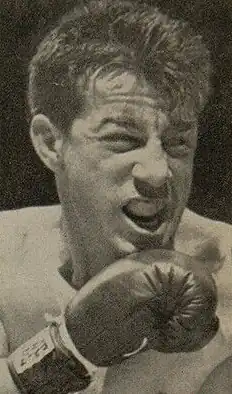 Thomas Rocco Barbella (January 1, 1919[1] – May 22, 1990), better known as Rocky Graziano, was an American professional boxer and actor who held the World Middleweight title.[2] Graziano is considered one of the greatest knockout artists in boxing history, often displaying the capacity to take his opponent out with a single punch. He was ranked 23rd on The Ring magazine list of the greatest punchers of all time. He fought many of the best middleweights of the era including Sugar Ray Robinson. He was the subject of the 1956 film, Somebody Up There Likes Me, based on his 1955 autobiography, starring Paul Newman as Graziano.