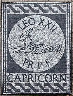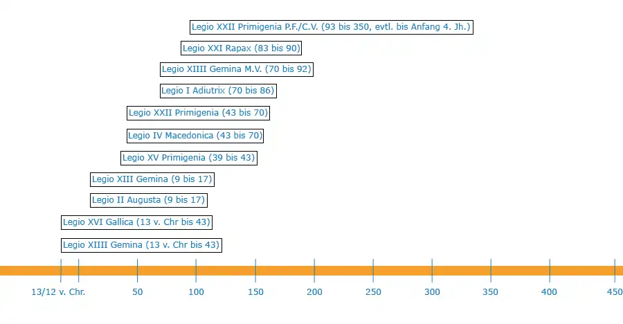 A total of nine different legions were stationed in Mogontiacum during the Principate period. Between the years 9 and 17, the troop presence reached its peak with four simultaneously stationed legions and their auxiliaries with an estimated 50,000 soldiers. From the year 93, the Legio XXII Primigenia Pia Fidelis (later with the honorific names Antoniniana, Severiana and Constantiniana Victrix) was the only legion to occupy the legionary camp until the middle of the 4th century, possibly in parts until the beginning of the 5th century.[24] The Notitia dignitatum, which is dated to the first third of the 5th century, mentions the milites Armigerie, presumably a kind of citizen militia, for the final period of Roman Mogontiacum. They were stationed within the city limits and were under the command of the Dux Mogontiacensis or a Praefectus militum armigerorum Mogontiaco.