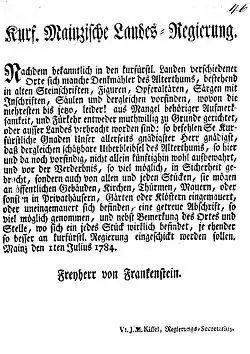 - ^ Pelgen, Franz Stephan, ed. (2003). Mainz: vom "elenden Steinklumpen" zum Denkmal ; aus der Geschichte der Mainzer Römerruinen [Mainz: from a "miserable lump of stone" to a monument ; from the history of the Roman ruins in Mainz]. Archäologische Ortsbetrachtungen (in German). Mainz am Rhein: von Zabern. p. 30. ISBN 978-3-8053-3283-5.