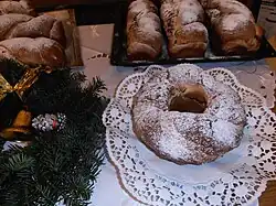 - Mucenici/sfințișori - sweet pastries (shaped like "8", made from boiled or baked dough, garnished with walnuts, sugar, or honey, eaten on a single day of the year, on 9 March)[25]