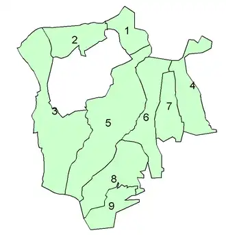 Before 1894 the urban part of Romford parish corresponding to the town was covered a local board of health. Under the 1894 legislation the parish was split with the former board of health district becoming the Romford Urban parish in Romford Urban District and the remainder formed the Romford Rural parish within the larger rural district. A parish council of nine members was formed for Romford Rural parish.[2] The arrangement did not last and in October 1896 the parish council resolved to seek amalgamation with Romford Urban. This was reciprocated by December 1898.[3] In 1900 the two parishes were abolished and their former area used to create a Romford parish which constituted the enlarged Romford Urban District.[4]