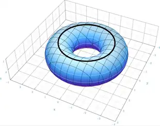 X ( π / 2 , ϕ ) = ( 2 cos ϕ , 2 sin ϕ , 1 ) {\displaystyle X({\pi /2},\phi )=(2\cos \phi ,2\sin \phi ,1)\,} X ( 3 π / 2 , ϕ ) = ( 2 cos ϕ , 2 sin ϕ , − 1 ) {\displaystyle X({3\pi /2},\phi )=(2\cos \phi ,2\sin \phi ,-1)\,} which represent two extremal circles over the torus M {\displaystyle M} .