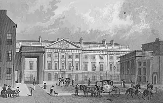 The Royal Mint, previously housed in the Tower of London, moved to the site between 1806 and 1811, and the Mint's new buildings were finished by the end of 1809. The main building, designed by James Johnson and completed by Robert Smirke, contained apartments for the Deputy Master of the Mint, the Assay Master, and the Provost of the Moneyers as well as bullion stores and the Mint Office. In addition to the main building, the site included two gatehouses, buildings housing machinery, and dwelling houses for officers and staff. A boundary wall surrounded the site. A narrow alley known as the Military Way ran along the inside of the wall, patrolled by the Royal Mint's military guard. In the 1880s the machinery buildings were reconstructed and extended, and there was further rebuilding at the turn of the century. By the 1960s little of the original mint remained apart from the Smirke building and gatehouses.[11]
