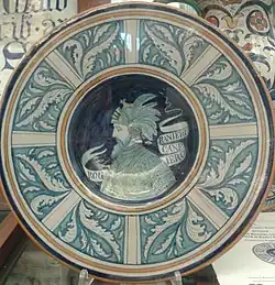 There is very little information about Ruggero Cane Ranieri's early activities: records from the fourteenth and fifteenth centuries and various documents provide numerous details of a military leader named Ruggero. However, they extend over such a very wide chronological period, they cannot possibly refer to a single individual, but rather to two separate people:[1] the first, also known by the name of Ruggero Cane, was a military man and diplomat in the fourteen seventies. He was a close friend of John Hawkwood (also known with his italian name: Giovanni Acuto) and a trusted person of Bernabò Visconti, dominant figure in Milan. The second is Ruggero, son of Costantino Ranieri (who then became better known as Ruggero "Cane" Ranieri) who, from the end of the fourteenth century, first served under Braccio Fortebracci da Montone and then became a leading light among the oligarchy of Perugia.