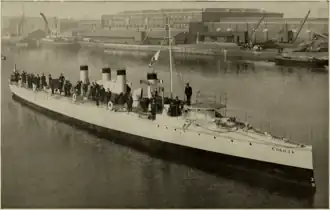 The Imperial Russian Navy was the second navy, after the British Royal Navy, to order destroyers, placing an order with the British shipbuilder Yarrow & Company, a specialist in torpedo craft, which had built five of the Royal Navy's first destroyers (the Havock and Charger classes).[1][2] Yarrow's design was similar to its designs for the Royal Navy, but the ship's hull made widespread use of nickel steel, with aluminium being used for some fittings to reduce weight.[2][3]