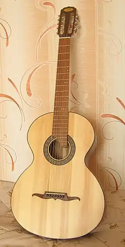 The Russian guitar (sometimes referred to as a "Gypsy guitar") is an acoustic seven-string guitar that was developed in Russia toward the end of the 18th century: it shares most of its organological features with the Spanish guitar, although some historians insist on English guitar descent.[1] It is known in Russian as the semistrunnaya gitara (семиструнная гитара), or affectionately as the semistrunka (семиструнка), which translates to "seven-stringer". These guitars are most commonly tuned to an open G chord as follows: D2 G2 B2 D3 G3 B3 D4. In classical literature, the lowest string (D) occasionally is tuned down to the C.