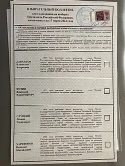 - ^ "Федеральный закон от 10.01.2003 N 19-ФЗ (ред. от 05.12.2017) "О выборах Президента Российской Федерации" Статья 77. Повторное голосование на выборах Президента Российской Федерации". КонсультантПлюс. Retrieved 5 March 2018.