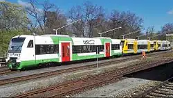 It has a total of 37 Stadler Regio-Shuttle RS1 lightweight railcars, of which 5 were purchased by ODEG in 2016 with the operating numbers VT 141 to 145. The railcars have 71 seats and 77 standing places in 2nd class. The trains are equipped with WC, heating and air conditioning. They are also equipped with a ticket vending machine and bicycle parking spaces. The destination station and the next stop are shown on two displays in each of the two door areas on the ceiling.[6]