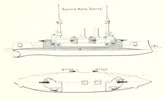 SMS Kaiserin und Königin Maria Theresia ("Empress and Queen Maria Theresa") was an armored cruiser used by the imperial Austro-Hungarian Navy from 1895 to 1917; she was the first ship of that type built by the Austro-Hungarian Navy. The ship was a unique design, built by the Stabilimento Tecnico Triestino shipyard in Trieste; she was laid down in July 1891, launched in April 1893, and completed in November 1894. Armed with a main battery of two 24-centimeter (9.4 in) guns and eight 15 cm (5.9 in) guns, the ship provided the basis for two subsequent armored cruiser designs for the Austro-Hungarian Navy.