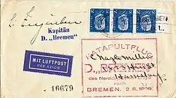 This voyage also marked the first time mail was carried by a ship-launched plane for delivery before the ship's arrival. A Heinkel HE 12 floatplane, flown by 27-year-old Luft Hansa pilot Baron Jobst von Studnitz, was launched at sea twenty miles east of Fire Island with 11,000 pieces of mail in six mailbags weighing 220 pounds (100 kg) which it delivered to New York many hours before the ship docked at the North German-Lloyd pier at the foot of 58th Street in Brooklyn.[2] On the return passage to Germany Bremen took the eastbound Blue Riband with a time of 4 days 14 hours and 30 minutes and an average speed of 27.91 knots (51.69 km/h), the first time a liner had broken two records on her first two passages. The mailplane was launched on the eastbound voyage in the English Channel near Cherbourg carrying 18,000 letters to Bremerhaven where it delivered the mail many hours ahead of the ship's arrival.[3][4] Bremen lost the westbound Blue Riband to her sister Europa in 1930, and the eastbound Blue Riband to Italian SS Rex in 1932.
