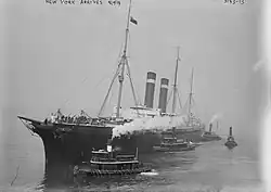 City of New York was a British built passenger liner that was designed to be the largest and fastest liner on the Atlantic. When she entered service with the Inman Line in August 1888, she was the first twin screw express liner in the world, and while she did not achieve the westbound Blue Riband, she ultimately held the eastbound record from August 1892 to May 1893 at a speed of 20.11 knots.[2] City of New York and her sister City of Paris are considered especially beautiful ships, and throughout their careers were rivals to White Star Line's Teutonic and Majestic. In February 1893, the Inman Line was merged into the American Line and, by act of Congress, the renamed New York was transferred to the US flag. Beginning in the mid-1890s, New York and Paris were paired with St Louis and St Paul to form one of the premier Atlantic services. New York continued with the American Line until 1920 and was broken for scrap in 1923. She served in the United States Navy as USS Harvard during the Spanish–American War, and Plattsburg in World War I. She is also remembered for nearly colliding with RMS Titanic as the latter ship departed on her maiden voyage in 1912.[3]