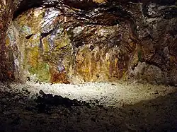The caverns consist of three chambers connected by galleries. In the first chamber, information is presented about the history of the mine — in the 16th to 19th centuries an alum shale mine that was closed in 1850 but opened for sightseeing in 1914.[3] The historical background includes information about environmental radiation treatments formerly offered there until such treatments were found to be hazardous.
