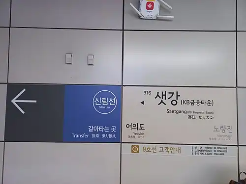 Saetgang Station is a railway station on Line 9 and the Sillim Line of the Seoul Subway.