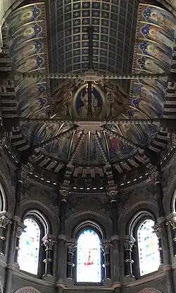 Mindful that the cathedral was unlikely to be finished in his lifetime, Burges produced comprehensive plans for its decoration and furnishing, recorded in his Book of Furniture and Book of Designs.[31] At the end of the 20th century, a major restoration of the cathedral, costing £5 million, was undertaken.[32] This included the reinstatement and restoration of the twin trumpets held by the resurrection angel which had been vandalised in 1999.[32] The restoration programme also saw the cleaning, repointing and repair of the exterior of the building, including the re-carving of some of Burges's gargoyles, where repair proved impracticable.[33] The cathedral's heating system was also replaced when it was found to be damaging the intricate mosaic floor.[34]