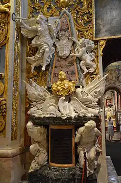 The funerary monument of Grand Master Marc'Antonio Zondadari (died 1722), nephew of Pope Alexander VII, is located close to the main entrance. It was originally meant to be installed in the Chapel of the Langue of Italy, but it was too large so it was placed in the nave.[23]