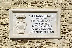 The tower gave its name to Tower Road, today one of Malta's most popular seaside promenades.[4] In 1951, the Government of Malta affixed a marble plaque on the tower with the coat-of-arms of the GrandMaster who built it.[5]