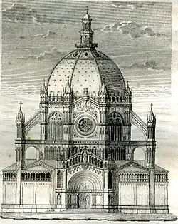 The building was designed by the architect Henri Désiré Louis Van Overstraeten and built between 1845 and 1888 in an eclectic style combining neo-Romanesque and neo-Gothic elements with influences from Byzantine and Roman architecture.[2] Following Van Overstraeten's death in 1849, his father-in-law Louis Roelandt took over the management of the works, then the architect Gustave Hansotte after Roelandt's death in 1864.[1] The stained glass windows were designed and crafted by the artist Jean-Baptiste Capronnier. Although unfinished, the church was opened to worship on 15 August 1853.[1]