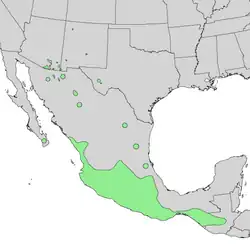 Besides the core range area, (of the northern Sierra Madre Occidentals) in Arizona–New Mexico and northeast Sonora,[4] two larger disjunct regions occur in west Texas and central Chihuahua.[4] South of Chihuahua, Chihuahua it is found at the Conchos River, and west of the city, a large area at the lake region. It also occurs in scattered, isolated locales of Durango, Sinaloa, and in the northeast at Nuevo Leon and Tamaulipas: also extreme southern Baja California Sur, (west of Sinaloa-Durango across the Gulf of California).[4] Besides parts of the Sierra Madre Occidental, locales occur in the southern Sierra Madre Oriental cordillera, but also small isolated locales as far northeast as the northeast states.