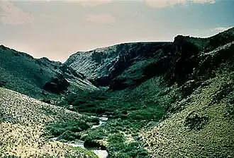 Salmon Falls Creek is a tributary of the Snake River, flowing from northern Nevada into Idaho in the United States. Formed in high mountains at the northern edge of the Great Basin, Salmon Falls Creek flows northwards 121 miles (195 km),[3] draining an arid and mountainous basin of 2,103 square miles (5,450 km2). The Salmon Falls Creek valley served as a trade route between the Native American groups of the Snake River Plain and Great Basin. Today, most of its water is used for irrigation.