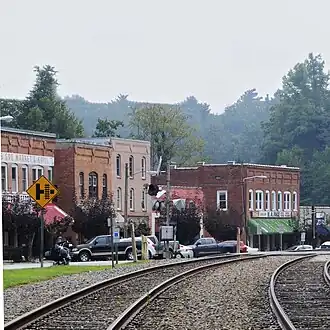 In 1878, there were only two houses in the limits of present-day Saluda. The completion of the Southern Railroad that same year brought about a large change in Saluda. The Saluda railroad grade is unmatched by any main line east of the Rocky Mountains with a grade that drops 600 feet (180 m) to the mile.[7] This included 50 curves, some horseshoe, and saved money by going over rather than through the mountains.[9] This section of railroad was originally built as the Asheville and Spartanburg Railroad. The railroad was built with convict labor, which marked the first such use on a large scale,[10] and was supervised by Colonel Andrew Tanner, who operated the first hotel in Saluda and was elected the first mayor of Saluda in 1881.[7] In 1887, eight passenger trains passed through Saluda daily, with about 3,000 visitors a year. The Saluda Grade was infamous for runaway train accidents. In 1880 alone, fourteen men were killed on the 3-mile (5 km) stretch of track.[11] Freight service along the line ended in December 2001 when Norfolk Southern suspended operations along the line between East Flat Rock, North Carolina and Landrum, South Carolina[12] before severing this segment from the rest of its system in April 2003.[13] Talks to convert this segment to passenger train excursion and a Rails-to-trails conversion made no headway in the 2000s and 2010s.[14] In February 2023, Norfolk Southern agreed to sell 31 miles of the Saluda Grade to the Saluda Grade Trail Conservancy, which plans to convert the segment to a rail trail.[15]