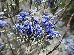 It grows about 2.5 ft tall and 3 ft wide, with many stems and a graceful appearance. The small (0.5 in) electric lavender-blue flowers grow in tight whorls and bloom profusely. Even though it flowers are in whorls, the calyces are all on one side, causing the flowers to sweep to one side. The calyces persist long after the flowers drop, and have a mint-like fragrance when rubbed.[1]