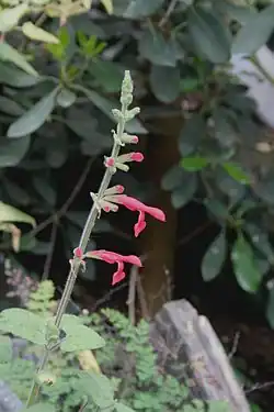 Salvia darcyi reaches 3 feet in height, with stoloniferous roots that spread over time and deltoid pastel green leaves that are very sticky. The bright coral red flowers are 1.5 inches long on inflorescences that reach up to 2 feet.[1]