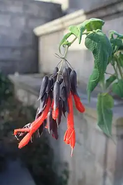 Salvia dombeyi, the giant Bolivian sage, is a tender perennial plant found at approximately 3000 m elevation in Peru, and is a popular subject for gardens. In cultivation, and with proper support, this vining sage can climb from 3–6 m. The heart-shaped dark green leaves have a long petiole with short hairs. The flowers are among the largest salvia flowers, typically at least 8 cm long—with a 4 cm currant-red calyx and a 9 cm scarlet corolla.[1]